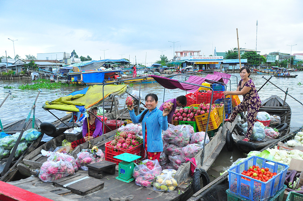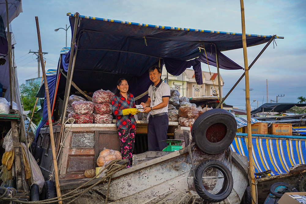 5 giờ sáng, khi mặt trời chưa ló dạng, những tiểu thương tại chợ nổi Ngã Năm (Sóc Trăng) đang loay hoay mua bán đã vô cùng bất ngờ khi Đoàn hành trình đến.
