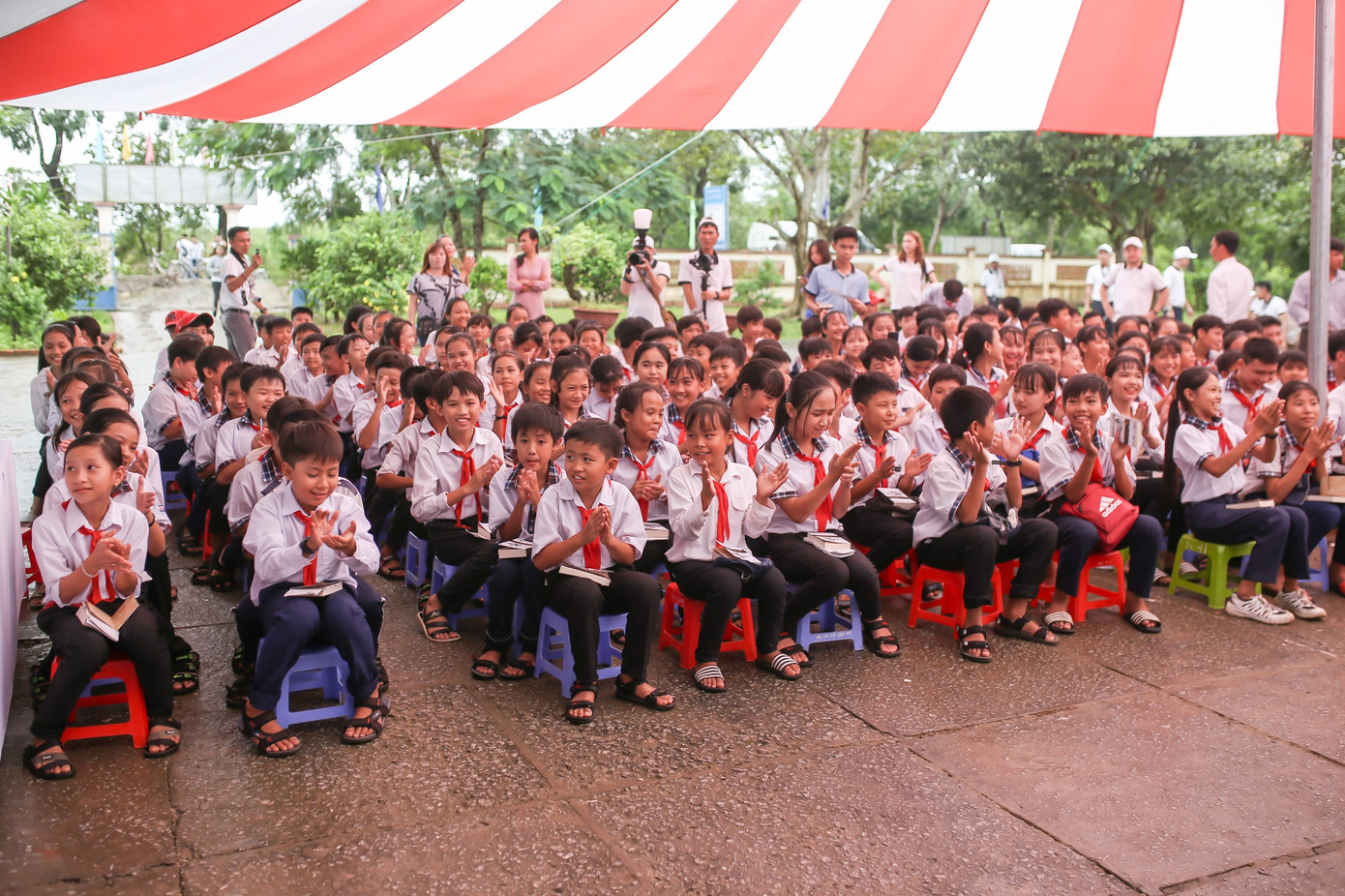 Các em reo hò, vui mừng vì lần đầu tiên gặp được những người nổi tiếng đến giao lưu, truyền cảm hứng. Nhiều em với gương mặt ngây thơ, đáng yêu đã quây quanh các người đẹp để chụp ảnh, xin chữ ký khi bước chân vào cổng trường.