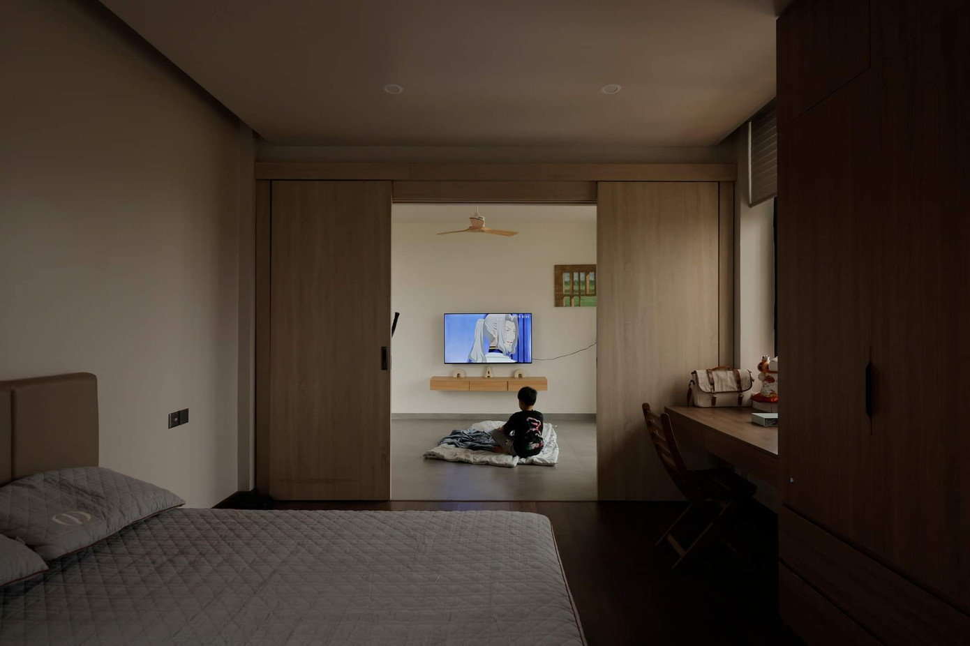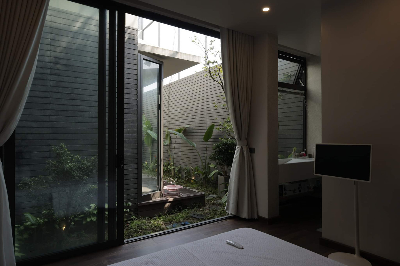 | Con đường xanh chạy qua phòng ngủ được thiết kế mở tầm nhìn ra vườn, ngay tại phòng ngủ này cha mẹ cũng có thể "nghe ngóng" những hoạt động của trẻ em ở khu vực nhà chính. |