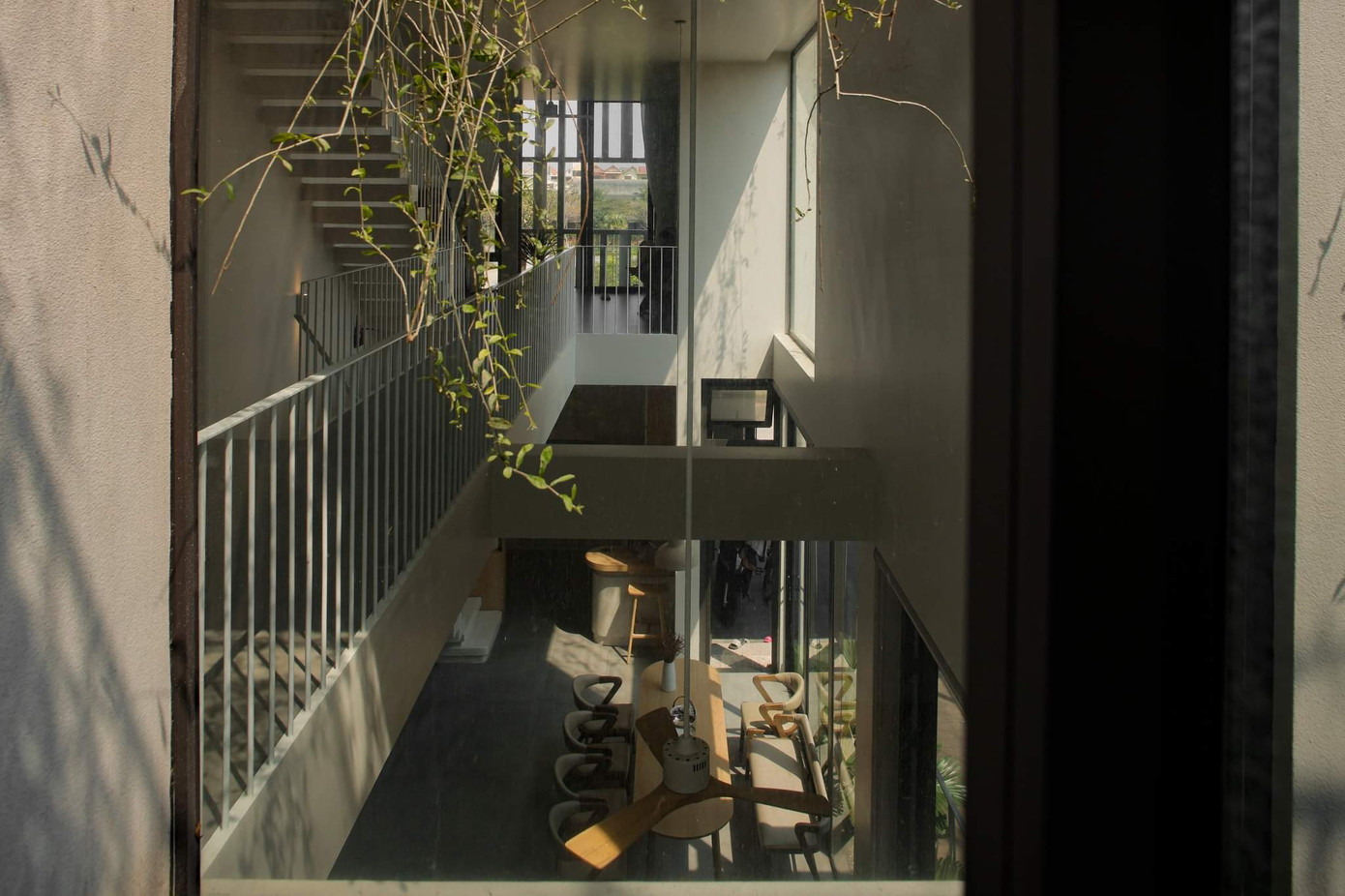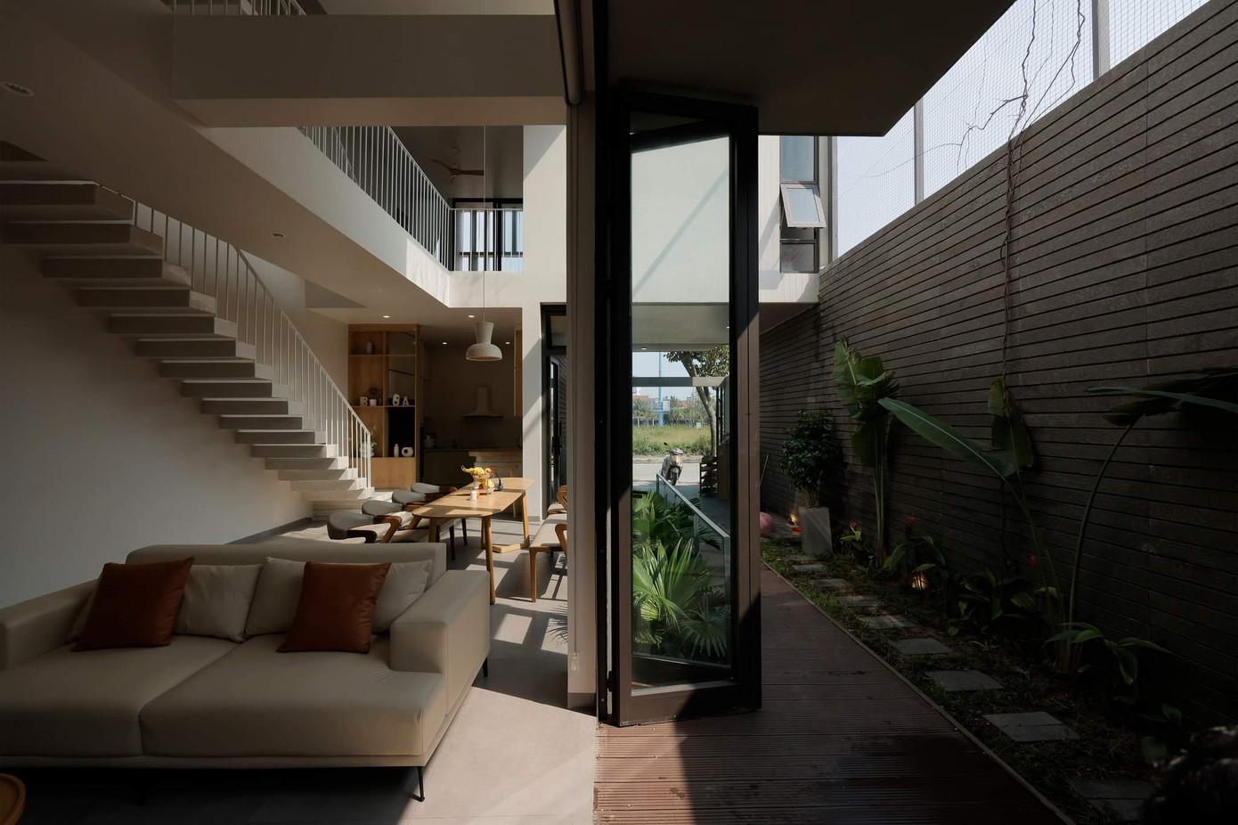 Dẫn lên hai phòng ngủ trên tầng 2 là cầu thang bê tông cắm tường thiết kế đơn giản, đảm bảo an toàn cho trẻ em. Một khoảng khoảng thông tầng hướng về khu vườn cho sự xuyên suốt tinh thần "đưa khu vườn xuất hiện khắp mọi ngóc ngách" của kiến trúc sư.