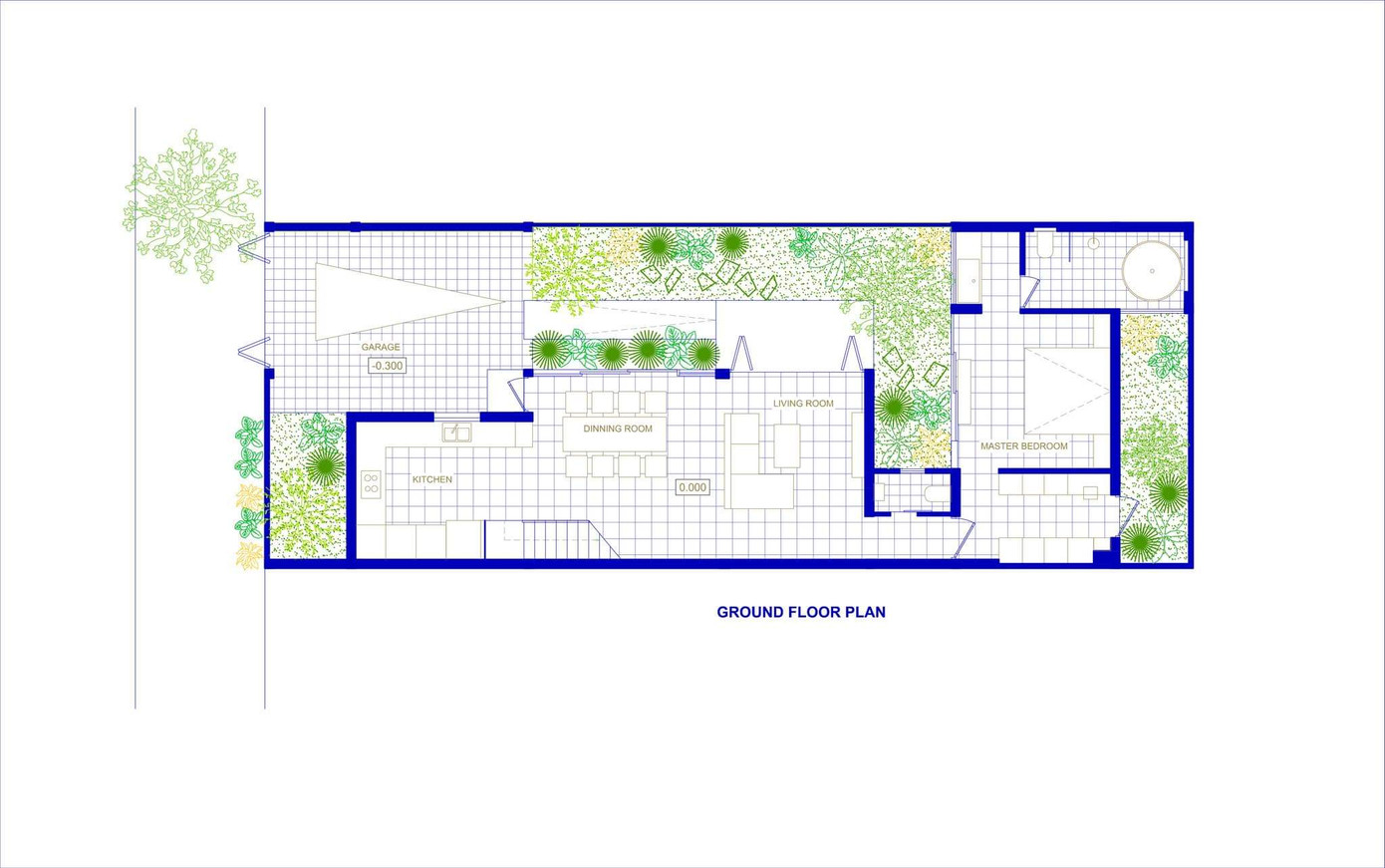 Để phá vỡ quan niệm mặt bằng nhà phố thông thường là cổng chính - phòng khách - phòng ăn - bếp - các phòng ngủ. Kiến trúc sư đã kéo giãn khoảng cách tiếp cận từ cổng chính tới phòng khách để tạo nên một hành trình đi xuyên qua góc vườn trước khi vào nhà.