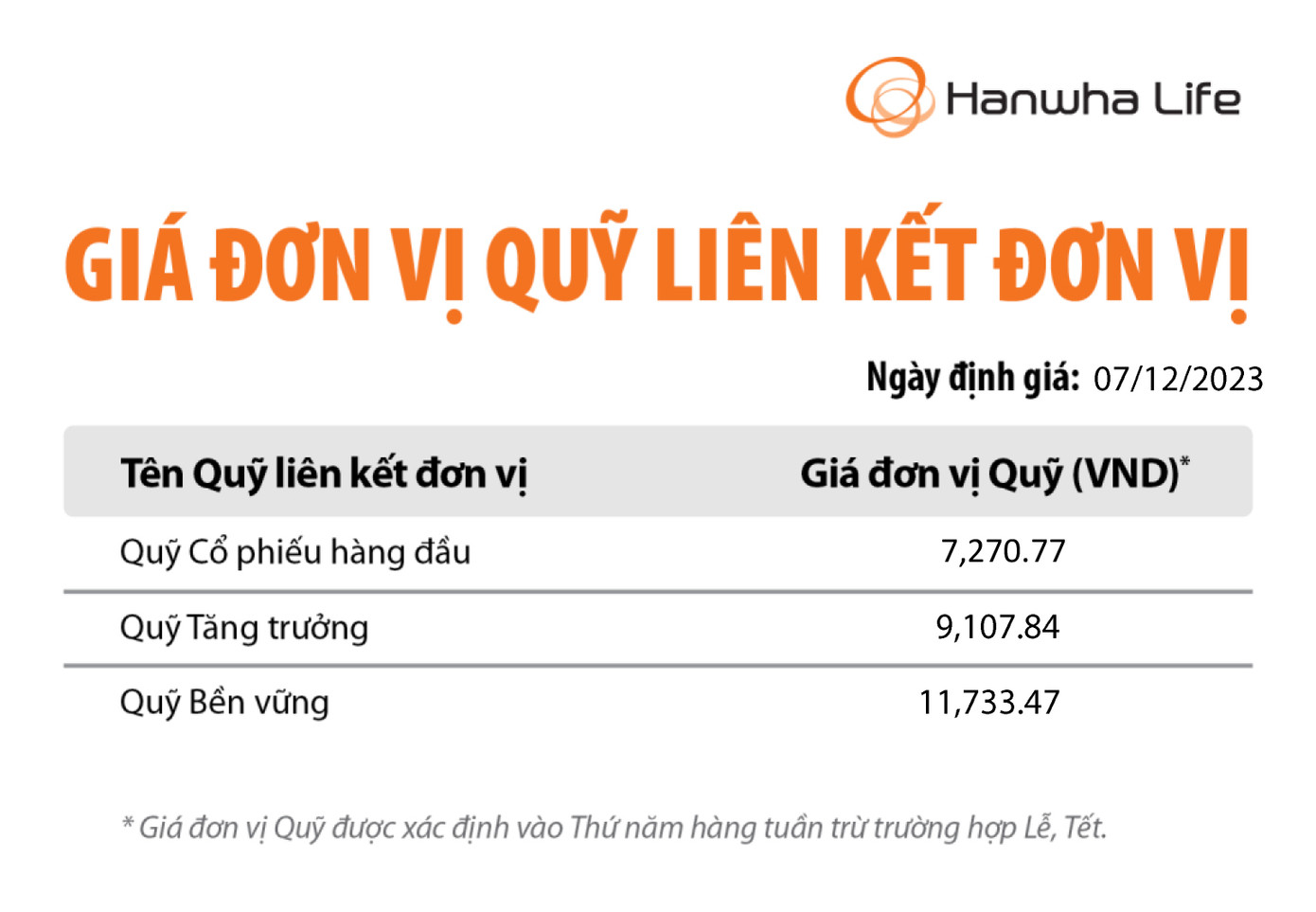 Hanwha Life Việt Nam thông báo Giá đơn vị Quỹ liên kết đơn vị theo ngày định giá 07 /12 /2023.
