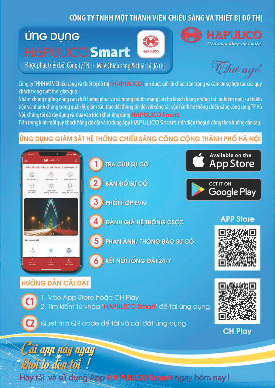 Ứng dụng trên điện thoại di động HAPULICO-Smart - Giúp cho việc kết nối giữa Công ty với người dân đang thụ hưởng dịch vụ CSCC, các cơ quan quản lý Nhà nước, cán bộ đô thị phường xã và chính quyền các địa phương được nhanh chóng, minh bạch và đồng thời cho phép kết nối giúp công tác đối chiếu, thanh toán cho hơn 2.500 trạm đèn chiếu sáng được thực hiện chính xác, nhanh chóng và hiệu quả.