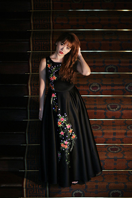 Với chiếc đầm đỏ, nữ ca sĩ chọn lối trang điểm đậm, màu môi cùng gam với trang phục nhằm tạo nét thu hút.