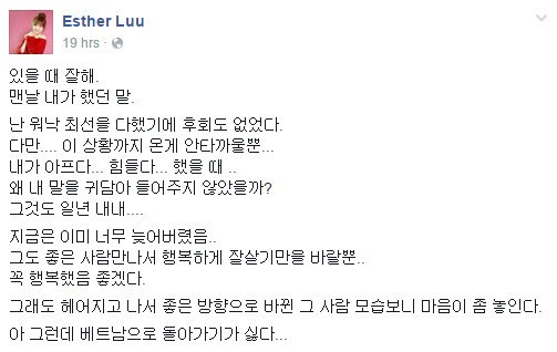 Sau khi công khai chuyện đường ai nấy đi với người yêu 9 năm Đinh Tiến Đạt, Hari Won lặng lẽ về Hàn Quốc cùng gia đình. Mới đây, cô chia sẻ trên trang cá nhân status khá tâm trạng. Dù không đề cập cụ thể, nhưng qua dòng tâm sự này, khán giả cảm nhận được sự đau khổ cũng như dần đoán nguyên nhân của sự tan vỡ bắt nguồn từ sự vô tâm của chàng rapper. Chưa hết, cuối chia sẻ cô còn cho biết không thích quay trở lại Việt Nam.