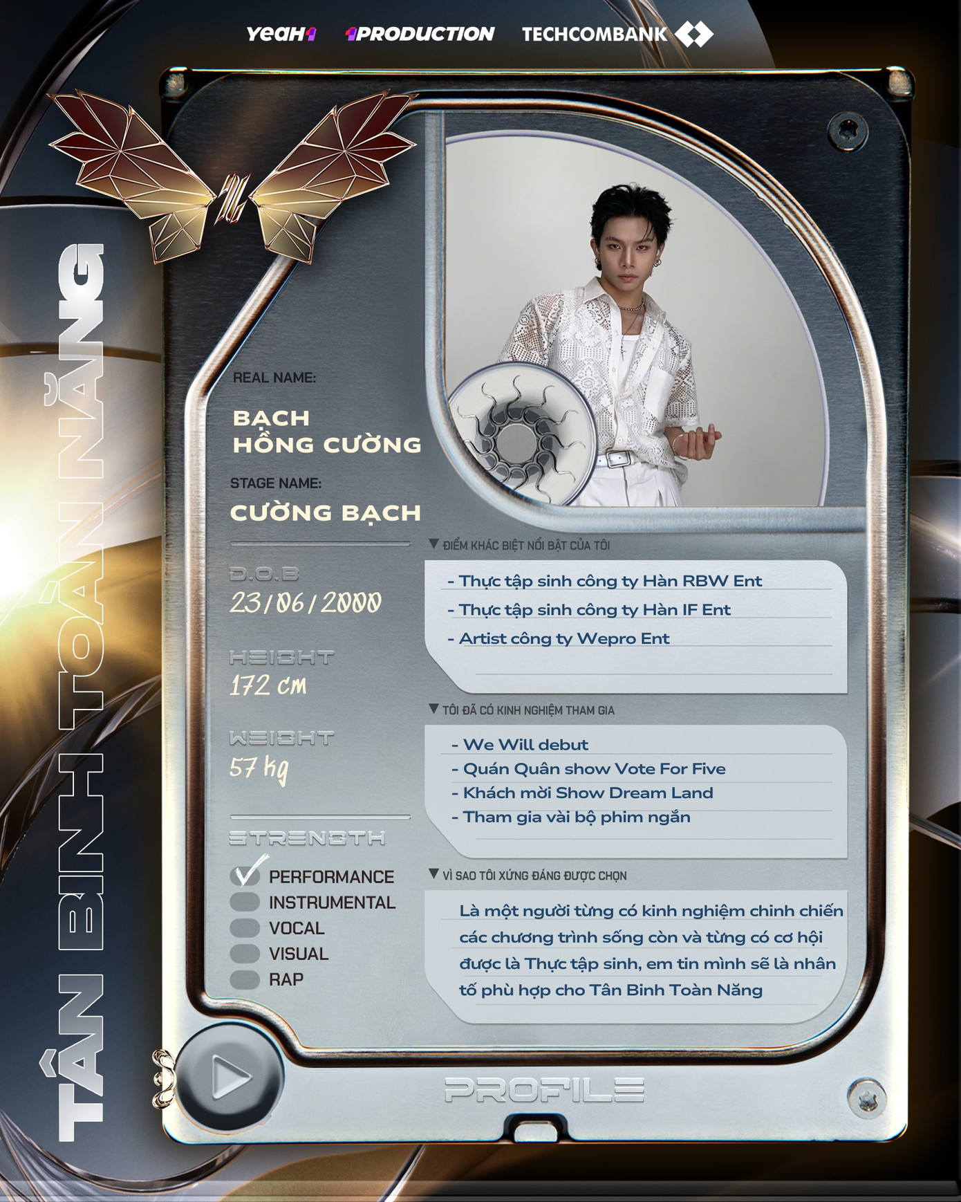 Từng là thành viên nhóm nhảy B-Wild, lọt vào đội hình quán quân của Vote For Five, có kinh nghiệm thực tập sinh ở 2 công ty giải trí Hàn Quốc... là những lý do khiến Cường Bạch (Bạch Hồng Cường) trở thành một trong những nhân tố được cho là chắc suất trở thành thí sinh chính thức của Tân Binh Toàn Năng 2025. Trong Vote For Five, anh nhận được lời khen "có cánh" từ Trúc Nhân: "Anh chưa từng thấy ai nhảy tốt và thần thái như em".