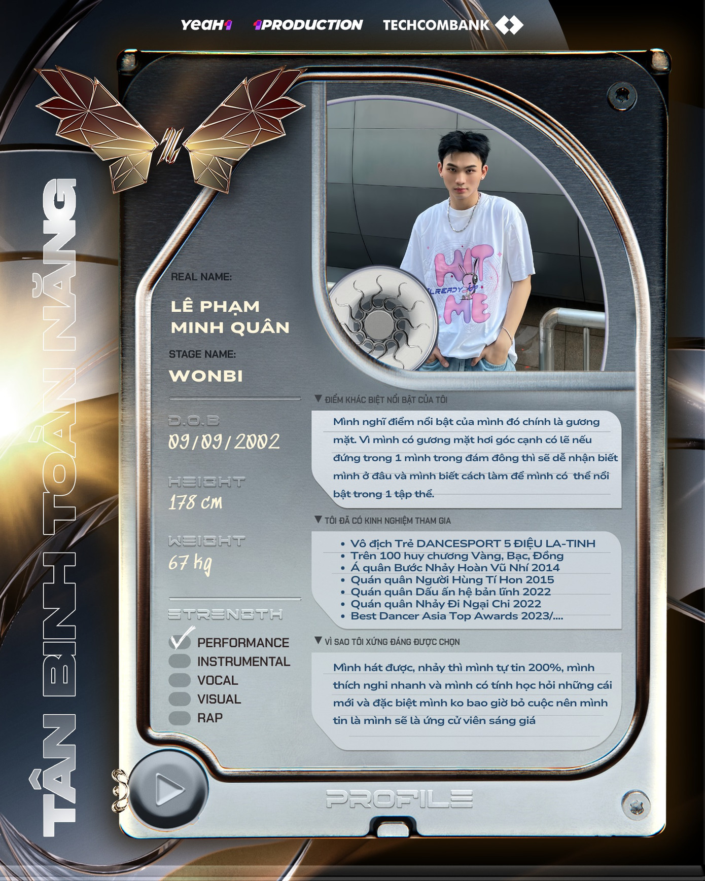 Một trong những profile dài nhất của dàn "ứng viên" Tân Binh Toàn Năng 2025 được công bố hiện tại thuộc về Wonbi (Lê Phạm Minh Quân). Nam vũ công khiến dân tình trầm trồ với loạt thành tích ấn tượng: Đạt trên 100 huy chương Vàng - Bạc - Đồng ở các cuộc thi, Best Dance Asian Top Awards 2023, Quán quân Nhảy Đi Ngại Chi 2022, Á quân Bước Nhảy Hoàn Vũ Nhí 2014.