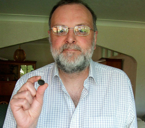 Ông Steve Easton và miếng cao su trên chiếc phi tiêu của súng đồ chơi - vật nằm trong mũi ông suốt 44 năm. Ảnh: SWNS.