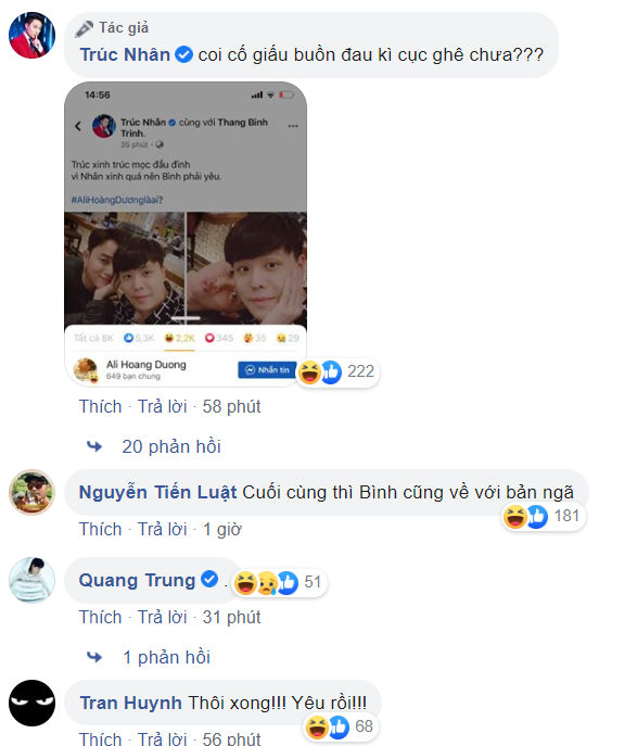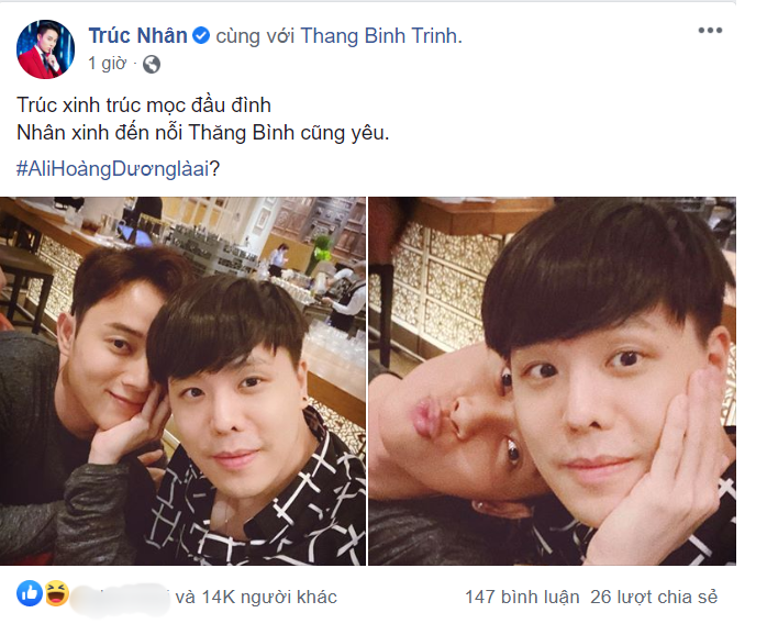 Trúc Nhân lại có một phen làm khán giả bất ngờ khi chia sẻ hình ảnh kèm caption: “Trúc xinh trúc mọc đầu đình. Nhân xinh đến nỗi Thăng Bình cũng yêu.” Cuối bài đăng, anh chàng không quên gắn tag “cà khịa” người bạn thân Ali Hoàng Dương khiến dân tình thích thú.