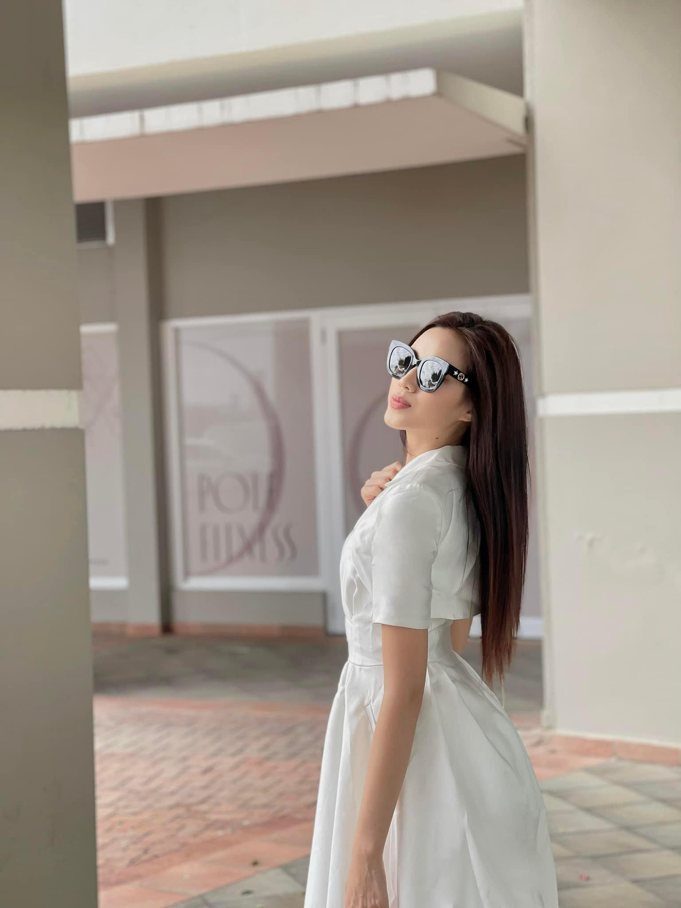 Diện bộ váy trắng kiểu dáng xoè cổ điển có độ dài chấm gót chân, Đỗ Thị Hà xinh đẹp và yêu kiều như một nàng tiểu thư. Người đẹp để tóc thẳng mượt và trang điểm rất nhẹ nhàng nhưng không quên sử dụng kính mát như một phụ kiện để tăng thêm vẻ sành điệu.