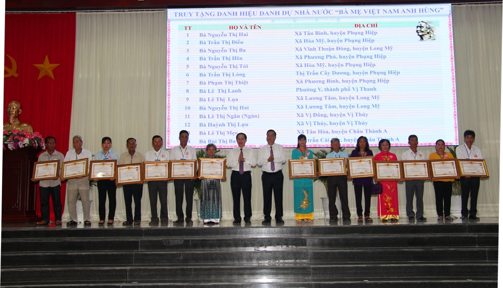 Tại buổi lễ, tỉnh Hậu Giang đã tổ chức truy tặng danh hiệu vinh dự Nhà nước “Bà mẹ Việt Nam anh hùng” cho 14 mẹ; trao tặng Huân chương Độc lập hạng Nhì, hạng Ba cho 16 gia đình liệt sĩ; truy tặng Huân chương Kháng chiến hạng Nhì, hạng Ba cho 4 cá nhân có thành tích trong cuộc kháng chiến chống Mỹ và cấp bằng “Tổ quốc ghi công” cho liệt sĩ Phạm Văn Thọ (xã Tân Hòa, huyện Châu Thành A).