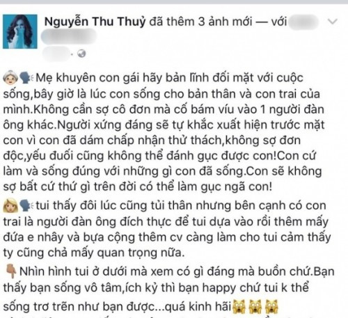Dù không chỉ đích danh, nhưng không ít cư dân mạng cho rằng Thu Thuỷ đang muốn nói về chồng cũ. Cô cũng chia sẻ những lời động viên, nhắn nhủ từ mẹ ruột giúp bản thân vượt qua quãng thời gian khó khăn: “Mẹ khuyên con gái hãy bản lĩnh đối mặt với cuộc sống, bây giờ là lúc con sống cho bản thân và con trai của mình. Không cần sợ cô đơn mà cố bám víu vào một người đàn ông khác.