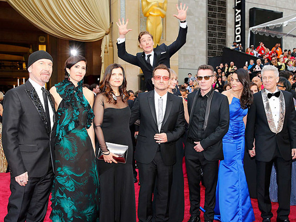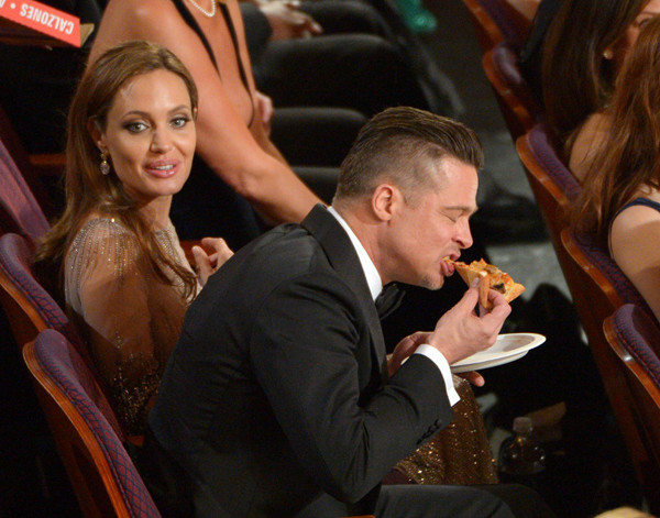 Brad Pitt nhắm nghiền mắt tận hưởng món pizza trong lúc đang xem lễ trao giải Oscar cùng Angelina Jolie
