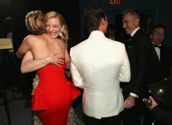 Minh tinh Cate Blanchett cười rạng rỡ khi được Jennifer Lawrence ôm chúc mừng cô giành chiến thắng Nữ diễn viên chính xuất sắc