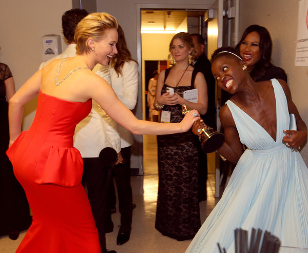 Ở cánh gà, Jennifer Lawrence định "cướp" tượng vàng của Lupita Nyong'o khi ngôi sao da màu đã đánh bại Jen để giành Nữ diễn viên phụ xuất sắc