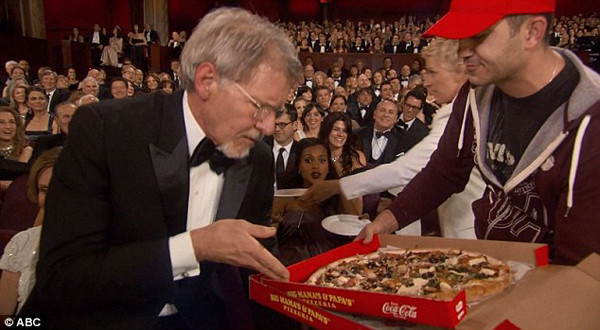 Diễn viên Harrison Ford đang lựa chọn loại pizza yêu thích của mình.
