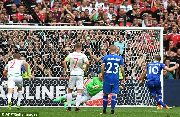 Trên chấm 11m, Sigurdsson dễ dàng bắn hạ thủ môn Hungary, mở tỷ số trận đấu cho Iceland.
