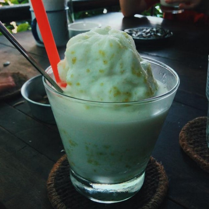 Trong 3 món cốt dừa thì có lẽ đây là món ngọt nhất, nhưng đậu xanh khá mát nên không chỉ giải khát mà đồ uống này còn giúp giải nhiệt nữa. Đậu xanh được xay cùng sữa, dừa, đá, nhưng khác với cốm xanh cốt dừa, đậu xanh sẽ được xay nhuyễn, cho đến khi hỗn hợp tạo thành màu vàng của đậu xanh nhìn khá đẹp mắt.