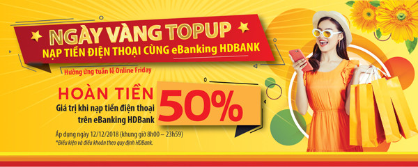 Theo đó, HDBank hoàn đến 50% (tối đa 50.000 đồng) cho các khách hàng đầu tiên thực hiện giao dịch nạp tiền điện thoại VnTopup trên hệ thống eBanking với mệnh giá thẻ nạp tối thiểu 100.000 đồng. Chương trình sẽ được áp dụng từ 08:00:00 đến 23:59:00, trong ngày 12/12/2018.