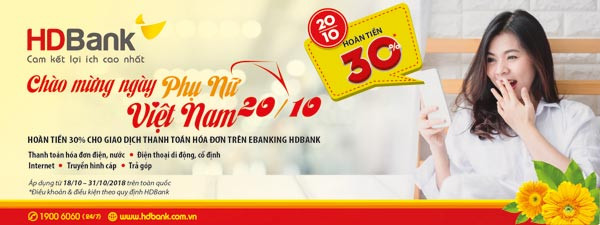 Chương trình ưu đãi này nhằm hướng đến việc tôn vinh phái đẹp nhân Ngày Phụ nữ Việt Nam 20/10 và tri ân các khách hàng đang sử dụng dịch vụ ngân hàng điện tử của HDBank. Theo đó, khi thanh toán hóa đơn tối thiểu 100.000 đồng thông qua kênh Internet Banking và Mobile Banking, khách hàng sẽ được hoàn tiền 30% giá trị giao dịch vào tài khoản cá nhân (số tiền hoàn tối đa là 90.000 đồng).