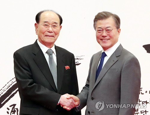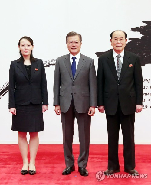 Theo Yonhap, trước khi bắt đầu cuộc họp sáng 10/2 tại Cheong Wa Dae (Seoul), Tổng thống Hàn Quốc Moon Jae-in đã chụp ảnh lưu niệm cùng Chủ tịch Quốc hội Triều Tiên Kim Yong-nam và bà Kim Yo-jong – em gái Chủ tịch Triều Tiên Kim Jong-un.