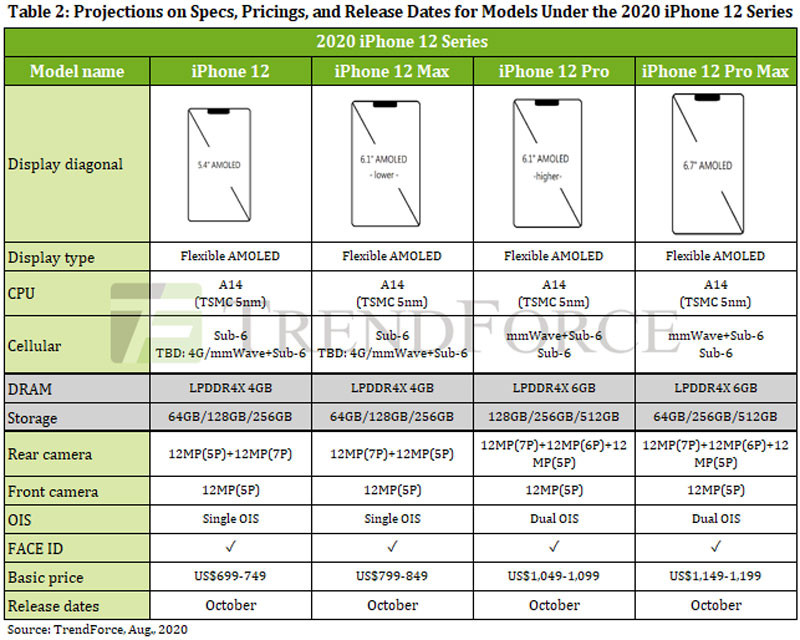 Theo TrendForce, tất cả các phiên bản của iPhone 12 Series đều được trang bị tấm nền màn hình OLED. Trong đó, iPhone 12 có kích thước 5,4 inch, iPhone 12 Max và iPhone 12 Pro sở hữu màn hình 6,1 inch, còn màn hình của iPhone 12 Pro Max là 6,7 inch.