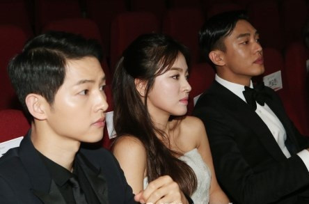 Yoo Ah In ngồi cạnh cặp đôi "Hậu duệ mặt trời" trong một sự kiện.