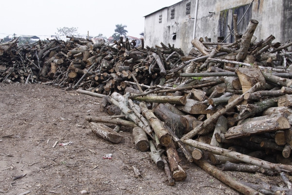 Một lượng gỗ lớn đằng sau công ty sản xuất giấy và bao bì Ngọc Dung thuê trên đất sản xuất nông nghiệp.