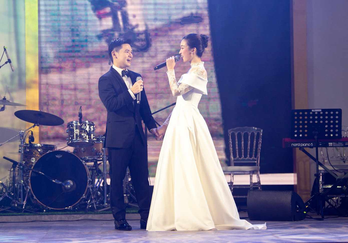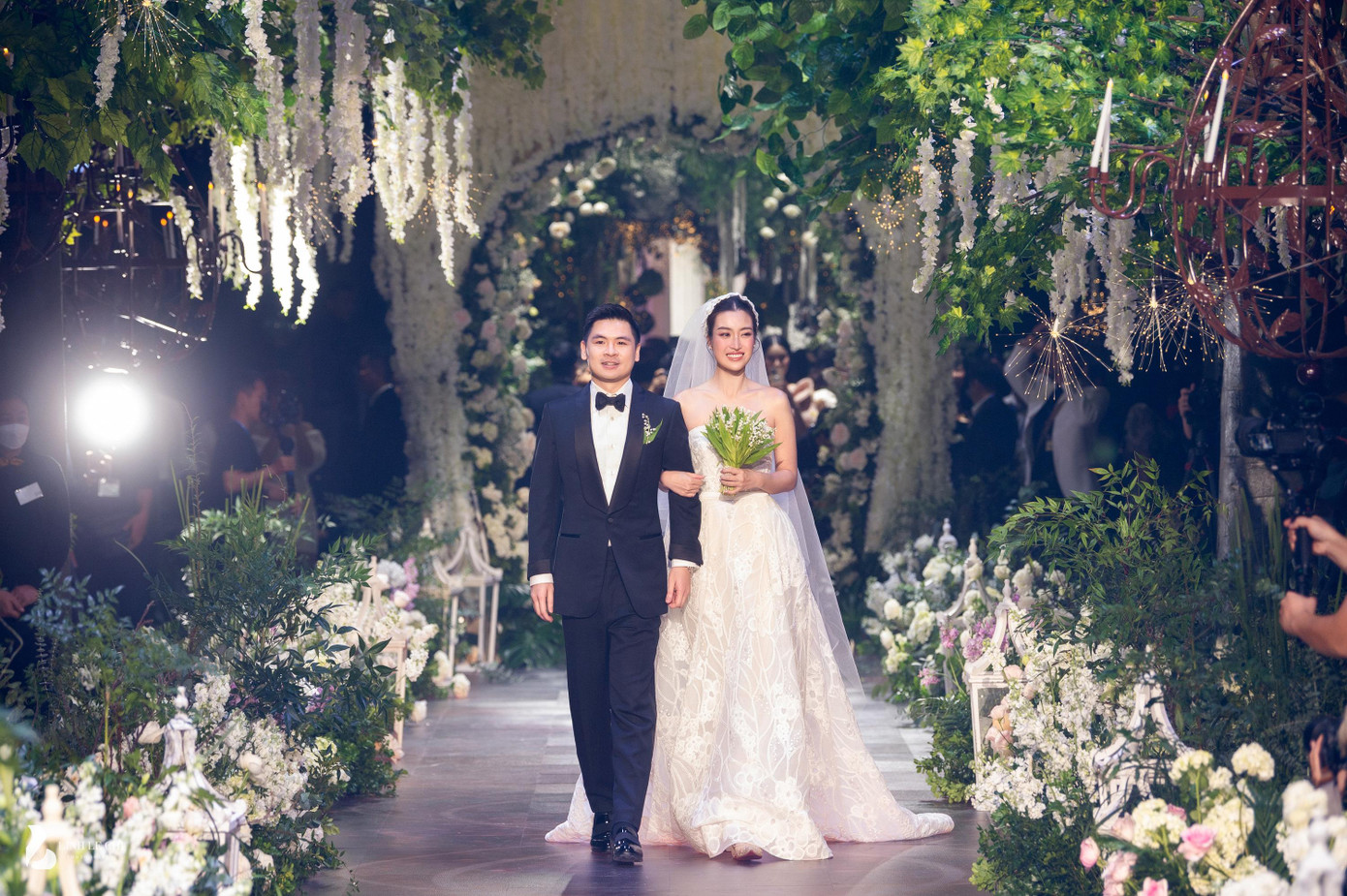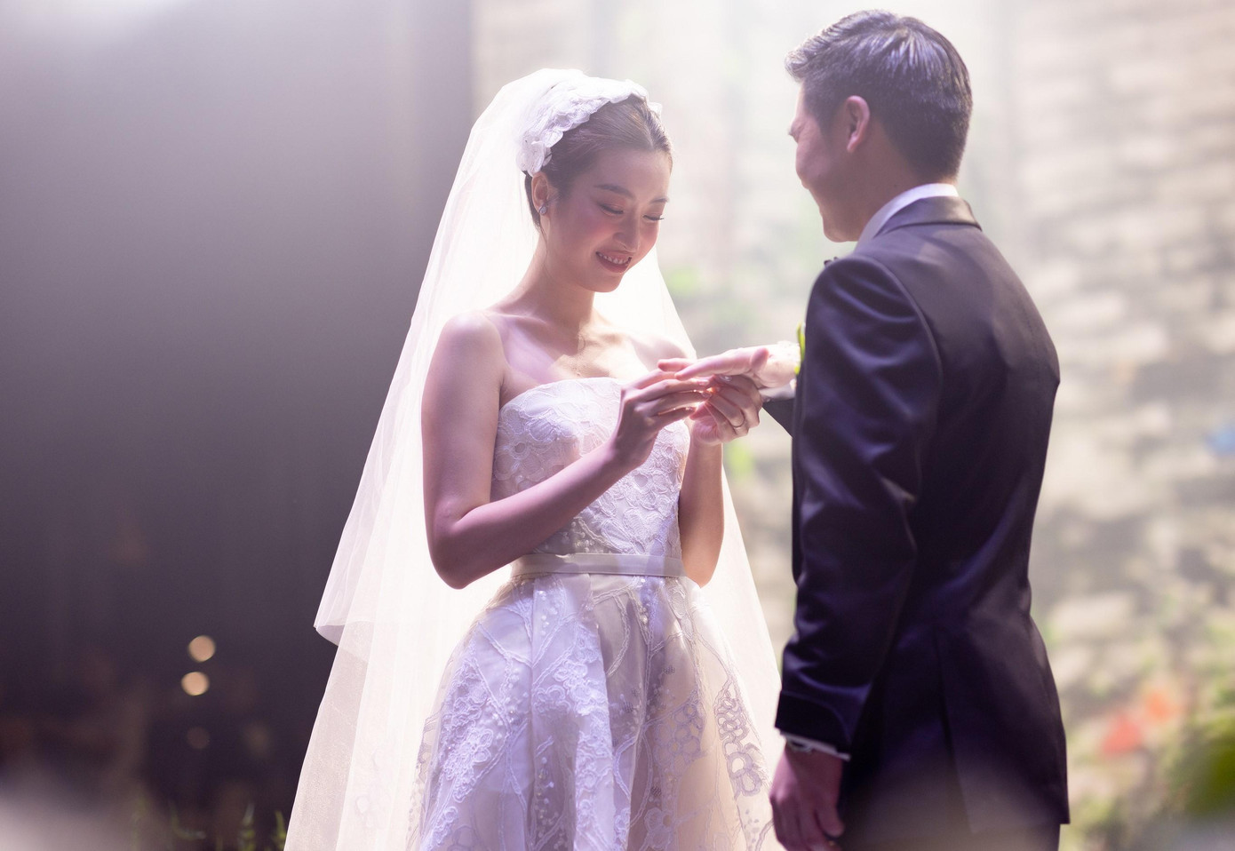 Khoảnh khắc được chờ đợi nhất là lúc chú rể Đỗ Vinh Quang trong bộ vét lịch lãm, ngập tràn hạnh phúc nắm tay cô dâu Đỗ Mỹ Linh bước lên lễ đường. Cả hai trao cho nhau nhẫn cưới và những lời hẹn ước cho hạnh phúc mai sau. Không gian ngập tràn hoa cùng sự sắp xếp tổ chức chỉn chu, đám cưới của Hoa hậu Đỗ Mỹ Linh trông không khác gì một đám cưới trong “cổ tích”.