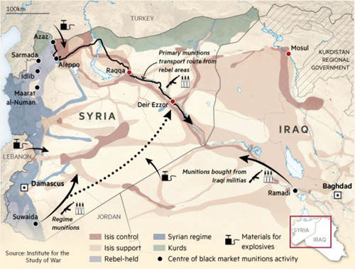 Hầu hết đạn dược đến từ Syria, nơi trở thành nguồn cung vũ khí, đạn dược chính cho cả khu vực. Những xe tải chất đầy đạn dược được các nhà tài trợ ở Vùng Vịnh chuyển cho các nhóm nổi dậy qua biên giới Thổ Nhĩ Kỳ. Quân nổi dậy "rút ruột" đạn dược từ các đoàn xe này và bán cho các lái buôn, biến các tỉnh biên giới Idlib và Aleppo trở thành thị trường vũ khí chợ đen lớn nhất ở Syria, theo người dân địa phương.
