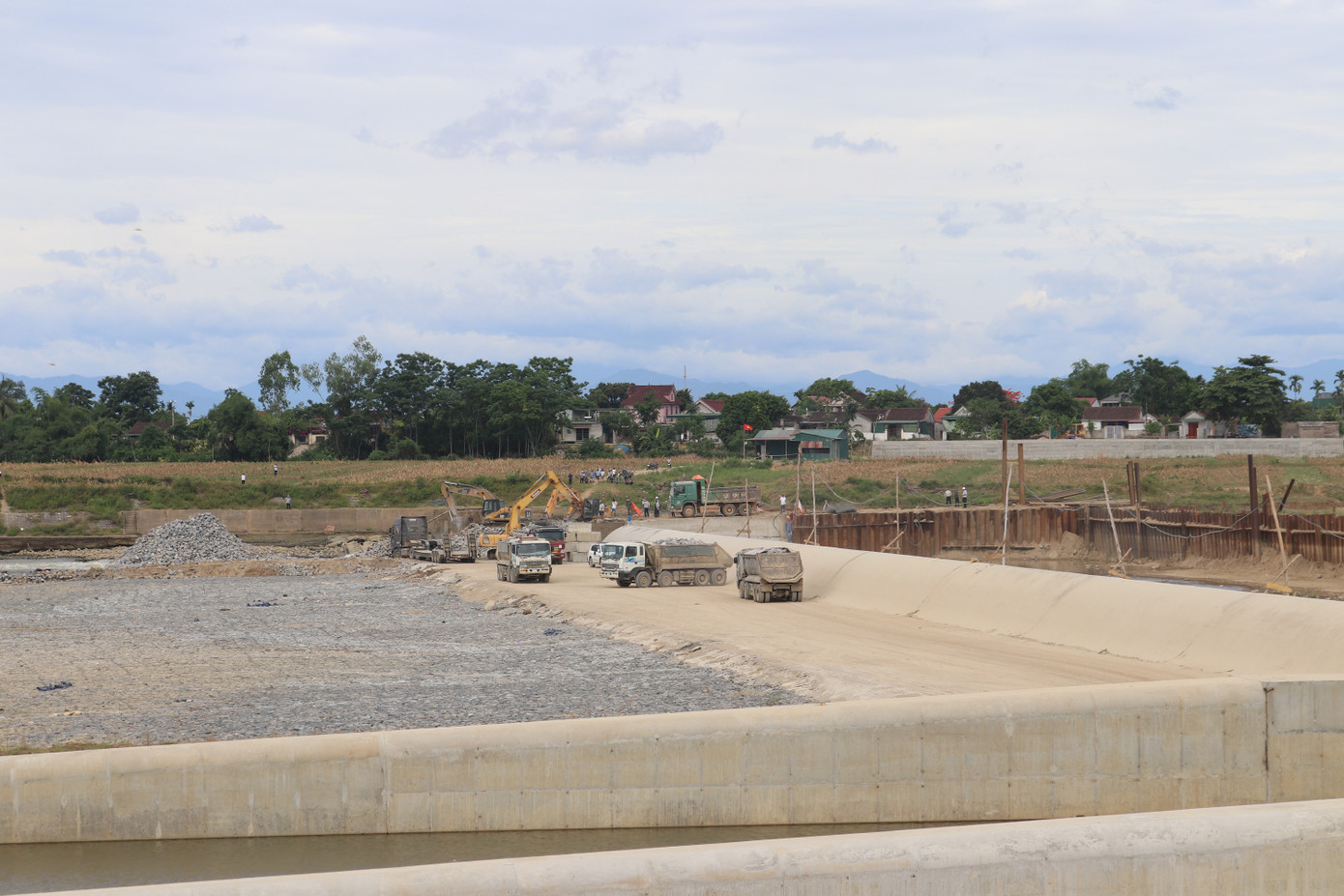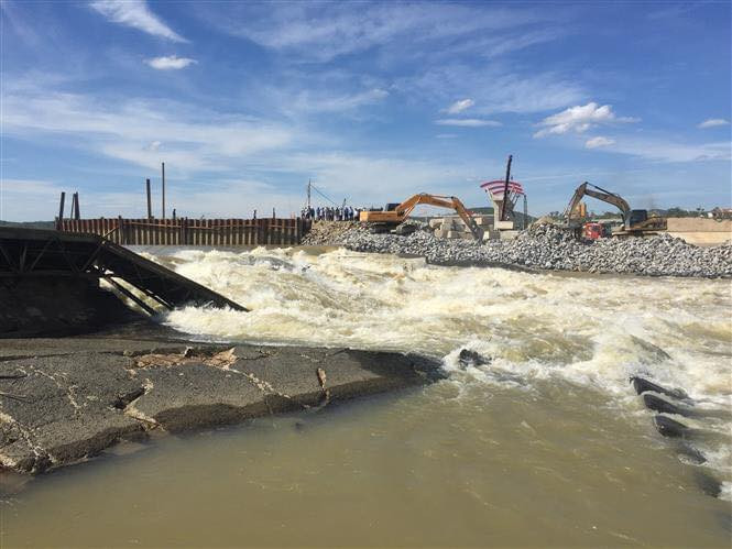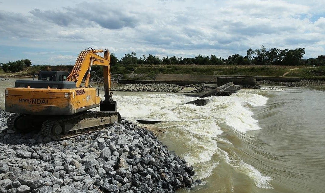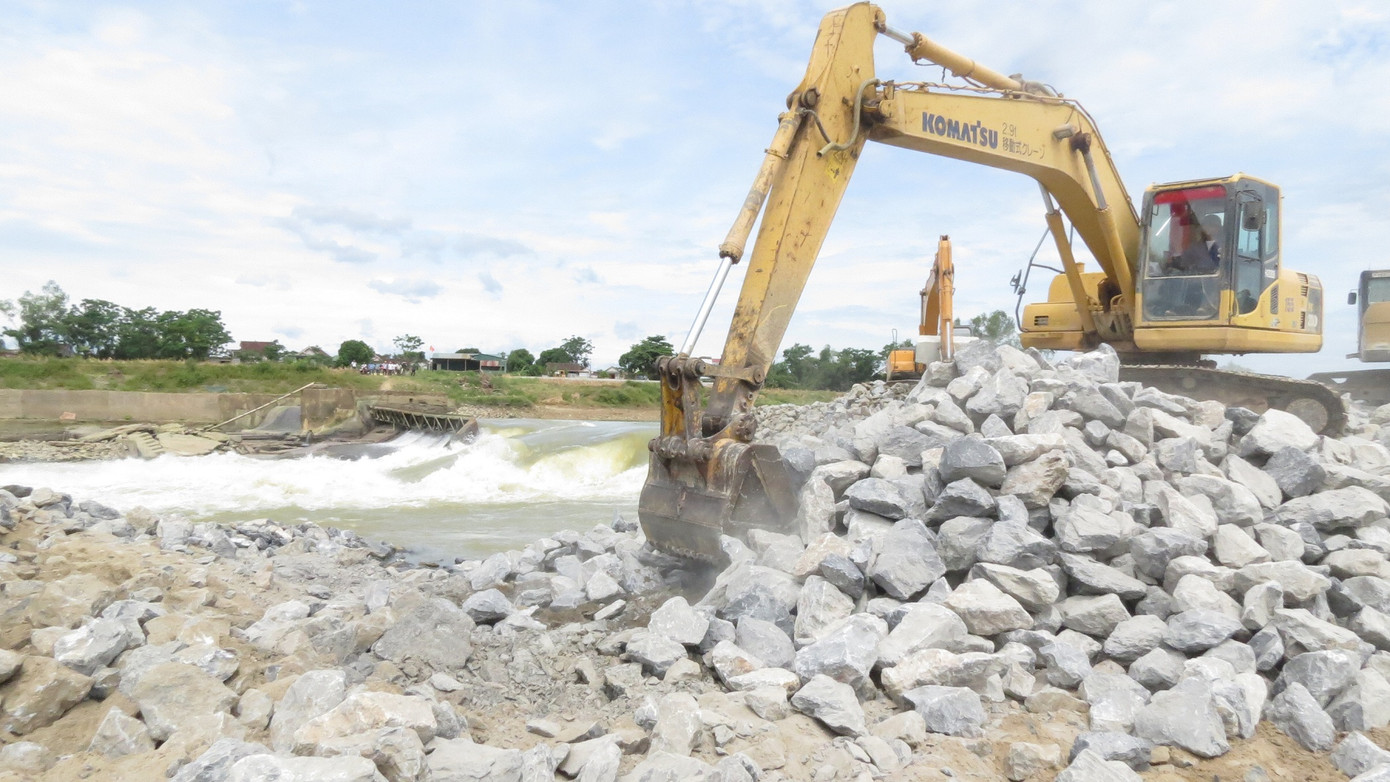 Khối lượng đá lớn được đưa vào công trường ngăn thành đập ở sông Lam