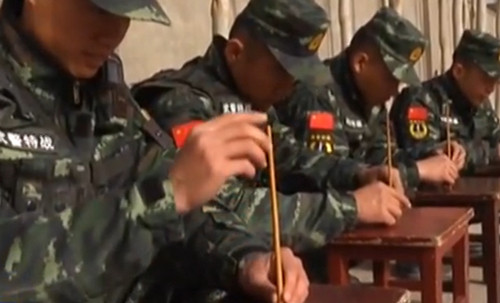 Xạ thủ của đội đặc nhiệm cảnh sát vũ trang Tân Cương dùng cây kim để xuyên qua một hạt gạo. Mục đích của bài tập này là rèn luyện tính nhẫn nại, cũng như tăng cường thị lực và độ tập trung.