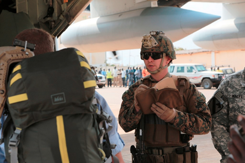 Hình ảnh trong cuộc sơ tán Đại sứ quán Mỹ tại thủ đô Juba, Nam Sudan ngày 3/1/2014. Người lính đưa các nhân viên ngoại giao tới nơi có phương tiện chờ sẵn để di chuyển.