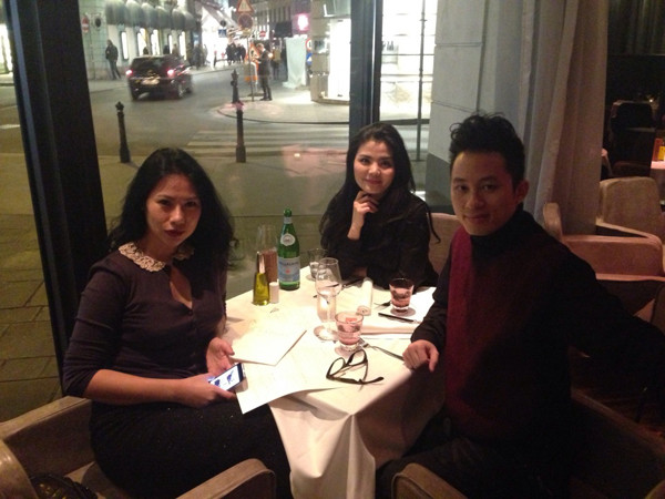 Cặp đôi chụp ảnh cùng một người bạn ngoại quốc trong chuyến lưu diễn của Tùng Dương ở nước ngoài.