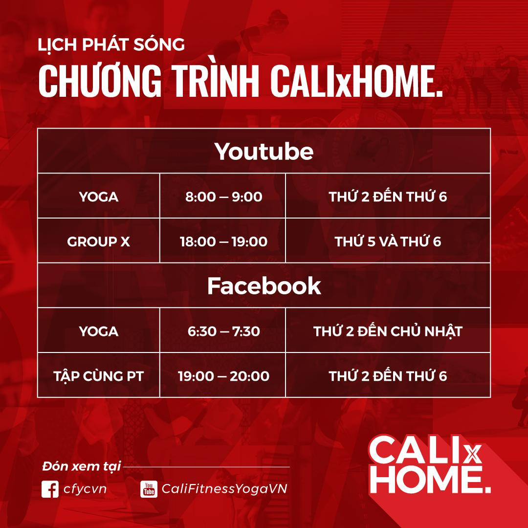 Việc nâng cao sức khỏe cùng hệ miễn dịch đang trở nên cấp thiết hơn bao giờ vì vậy mỗi ngày bạn có thể đồng hành cùng CALIxHOME tại nhà. Các buổi livestream với sự hướng dẫn của huấn luyện viên và thầy Yogi chuyên nghiệp sẽ được phát sóng đều đặn mỗi ngày. Bạn đọc có thể theo dõi trực tuyến trên Facebook fanpage và kênh Youtube của California Fitness & Yoga.