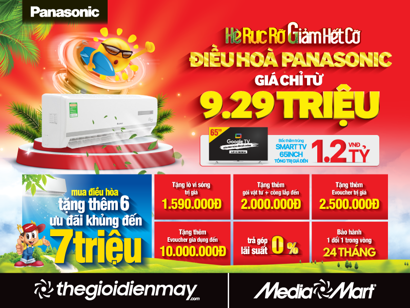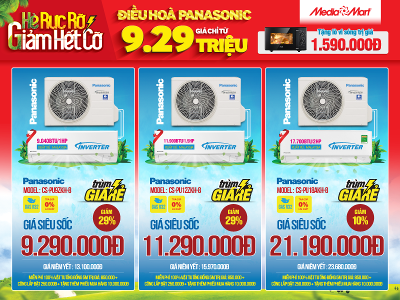 Phối hợp với Panasonic - một trong những thương hiệu điều hòa bán chạy hàng đầu Việt Nam và cũng là thương hiệu được người tiêu dùng Việt yêu thích hiện nay, chương trình “Hè rực rỡ, giảm hết cỡ” tại MediaMart hứa hẹn mang tới cơ hội mua sắm điều hòa Panasonic chất lượng với mức giá chỉ từ 9,29 triệu đồng, được tặng thêm lò vi sóng trị giá 1.59 triệu, bao trọn mọi phí.