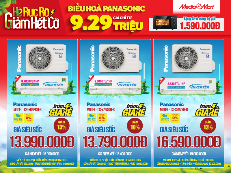 Trong chương trình “Hè rực rỡ, giảm hết cỡ” tại MediaMart, người tiêu dùng sẽ có cơ hội sở hữu ngay những chiếc điều hòa Panasonic trang bị những công nghệ tiên tiến này với mức ngân sách tiết kiệm tối đa: Điều hòa Panasonic 1 chiều Inverter 1HP-8.700BTU CS-XU9ZKH-8 từ 16,09 triệu nay giảm còn 13,99 triệu; Điều hòa Panasonic 2 chiều Inverter 1HP-9000BTU CS-YZ9AKH-8 giá đang bán 15,4 triệu nay ưu đãi giảm thêm còn 13,79 triệu; Điều hòa Panasonic 2 chiều Inverter 1HP-8.530BTU CS-XZ9ZKH-8 giá bán 19.08 triệu giảm còn 16,59 triệu…