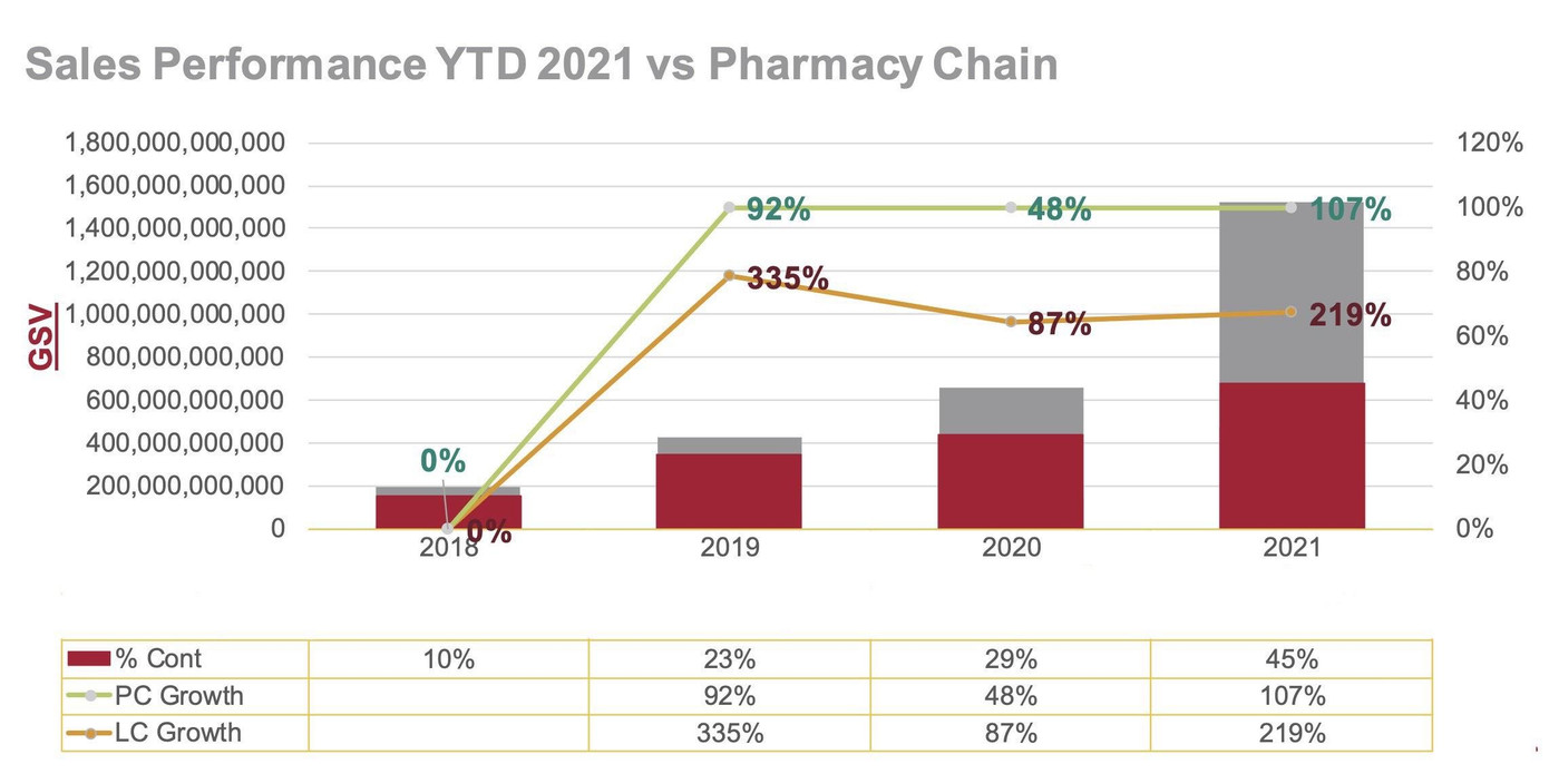 Theo báo cáo gần nhất của DKSH, tính đến hết quý 3 năm 2021, doanh số bán lẻ dược phẩm của các chuỗi nhà thuốc đạt mốc gần 1,050 tỷ, trong đó, hệ thống nhà thuốc FPT Long Châu đóng góp 475 tỷ, chiếm 45% tổng doanh thu. Kết quả đó đến từ nhờ vào độ phủ hơn 400 nhà thuốc trên toàn quốc và chiến lược hợp tác với các thương hiệu lớn trong ngành dược phẩm và thiết bị y tế.