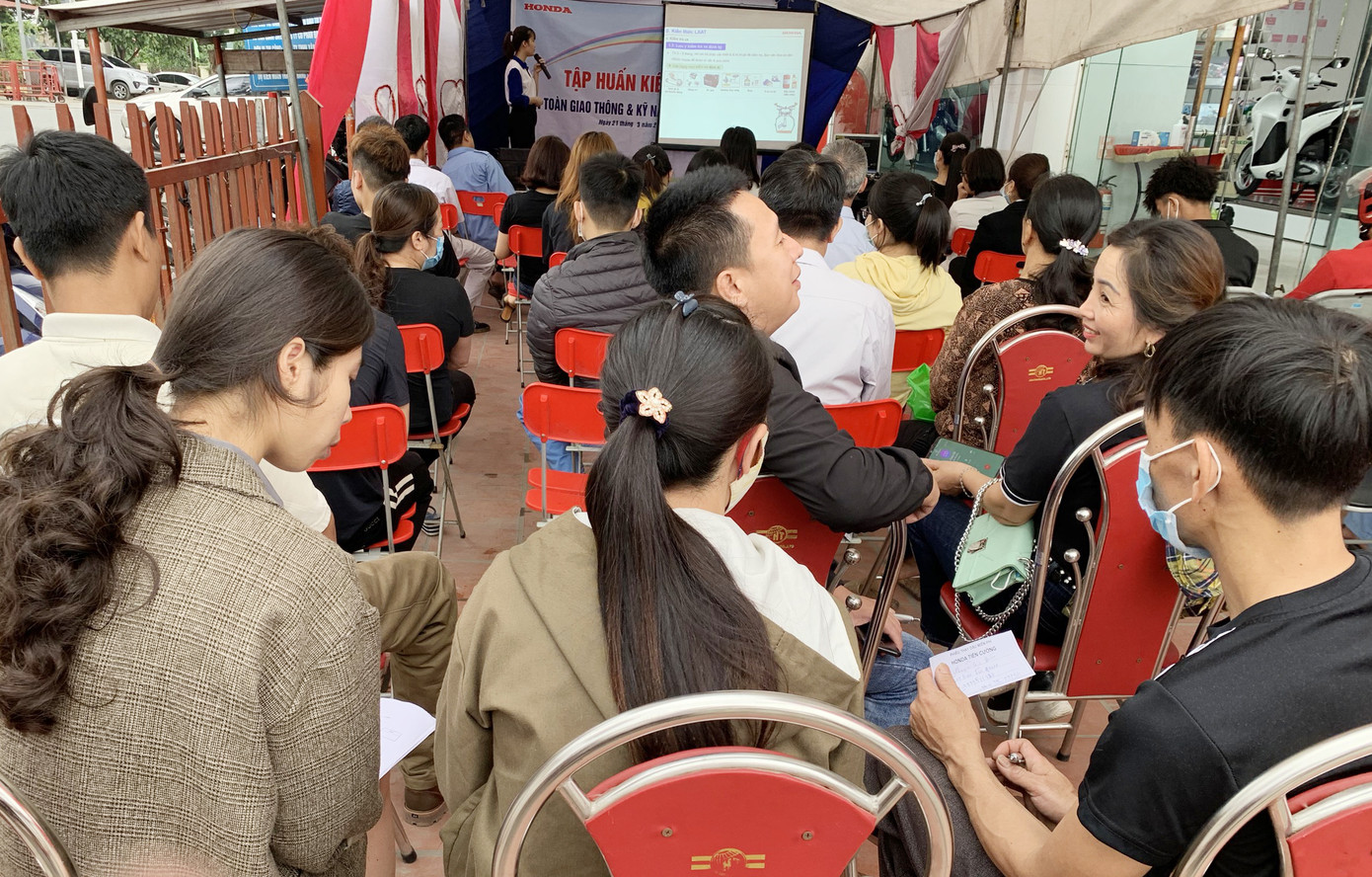 Những người có mặt đều chăm chú lắng nghe nhân viên tại cửa hàng Head Tiến Cường hướng dẫn để nắm chắc các kiến thức và kỹ năng lái xe an toàn.