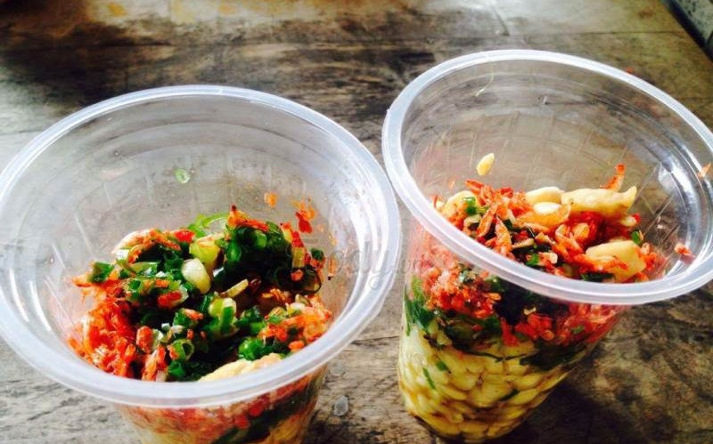 Không xe, không sạp, bắp nướng vỉa hè chỉ có duy nhất thùng bắp được lột sẵn hột, khỏi mất công cạp cạp dính răng. Cô chủ cứ thế múc bắp ra ly nhựa, thêm muỗng mỡ hành nóng hổi, thơm lừng, rắc miếng ruốc, miếng tóp mỡ. Xong. Việc còn lại là... thưởng thức. Bắp ở đây có vị ngọt ngọt, do được “chế biến” kèm gia vị, nước mắm (mình chưa tìm ra bí kíp) rất vừa ăn. Tất nhiên khác biệt hoàn toàn với ăn bắp trái quết mỡ hành nhé. Vì hột bắp rất mềm chứ không bị khô.