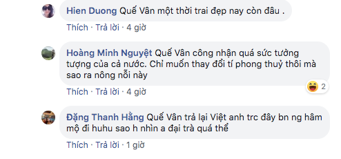 “Công nhận quá sức tưởng tượng của cả nước. Chỉ muốn thay đổi tí phong thuỷ thôi mà sao ra nông nỗi này”, “Một thời trai đẹp nay còn đâu”, “Quế Vân trả lại Việt Anh trước đây bao nhiêu người hâm mộ đi. Sao giờ nhìn anh đại trà quá thể”… là một số bình luận khác của người hâm mộ.