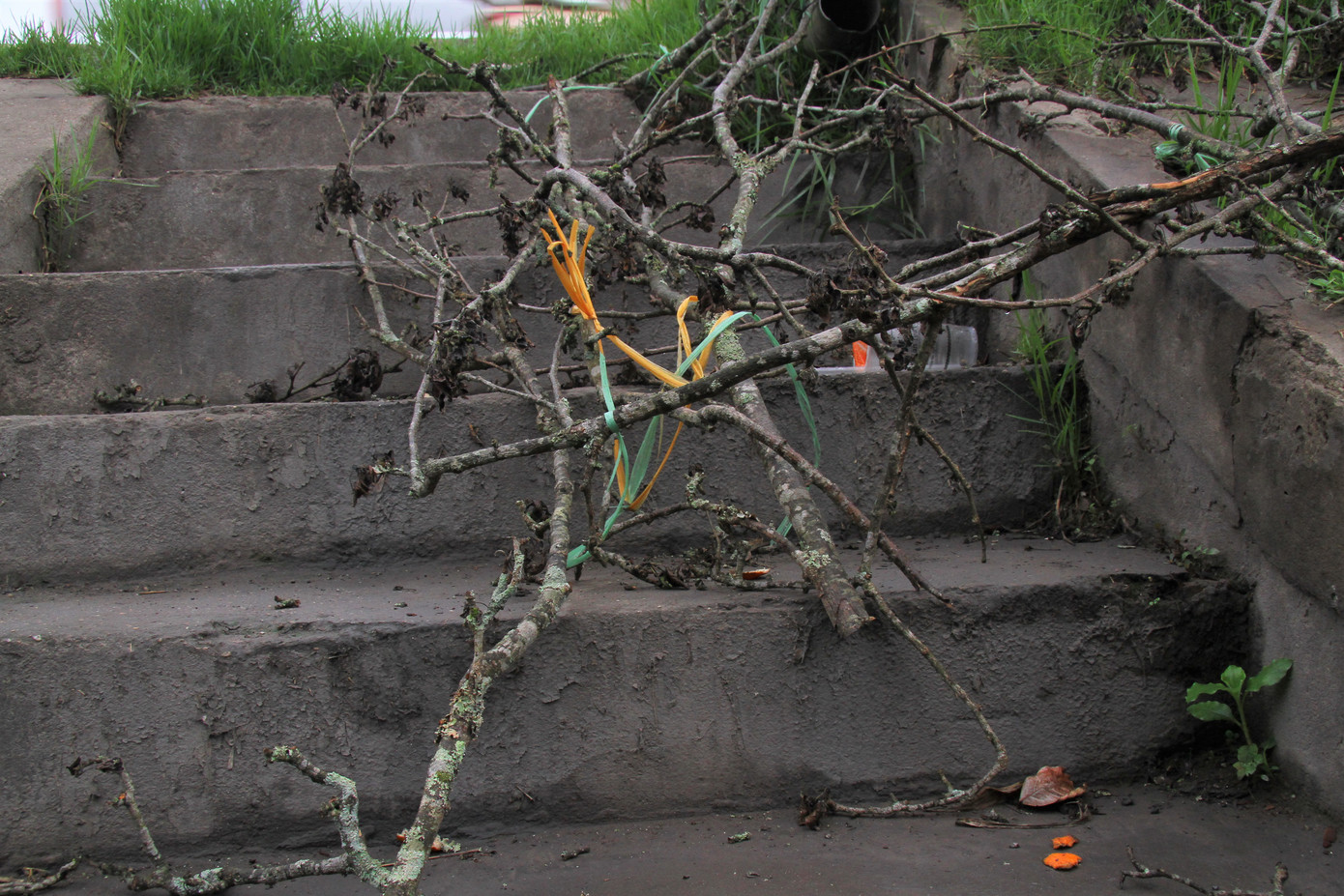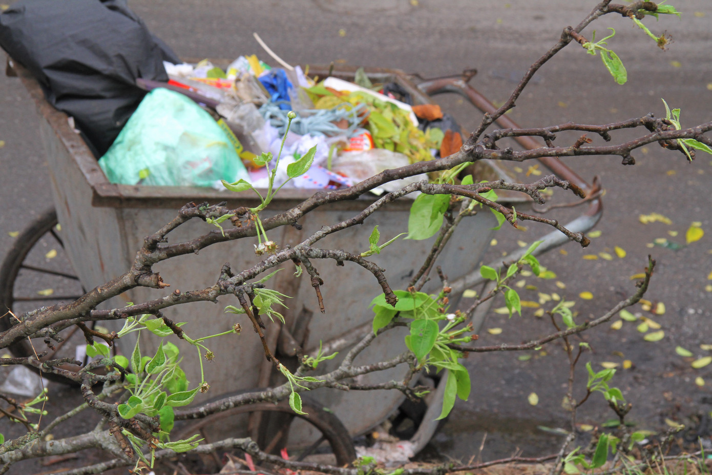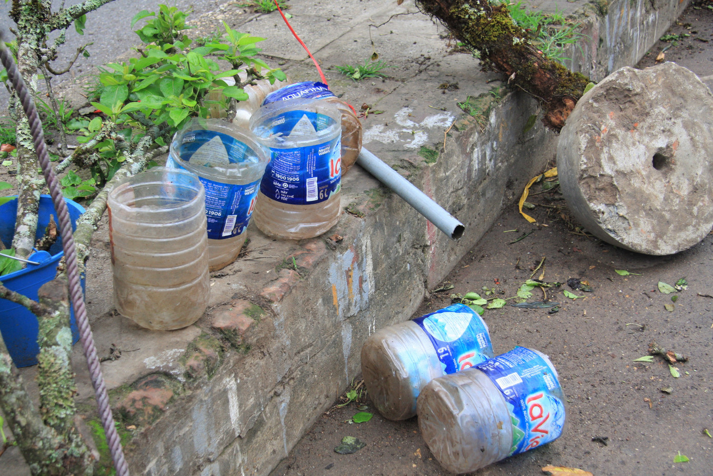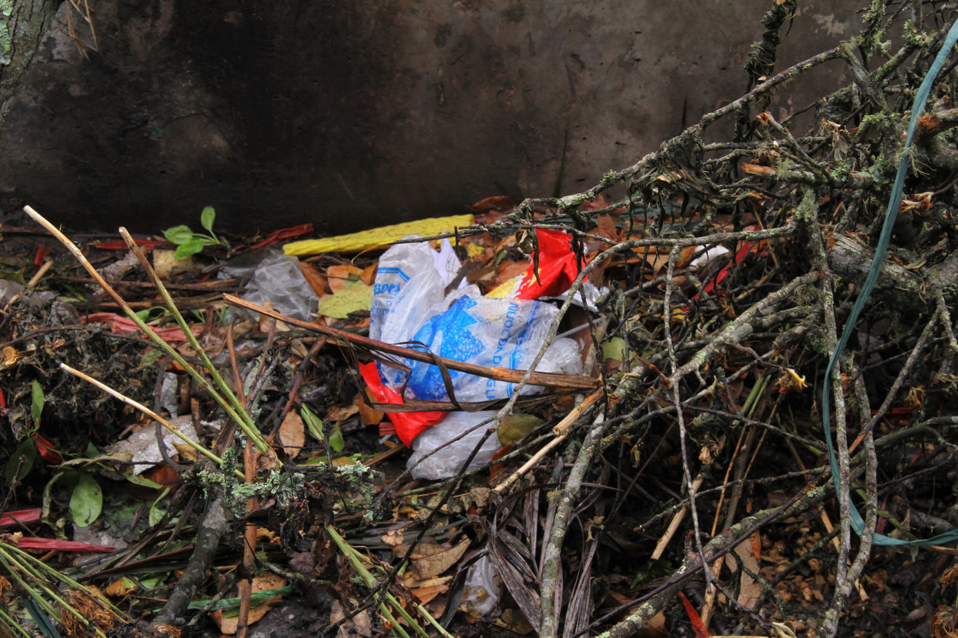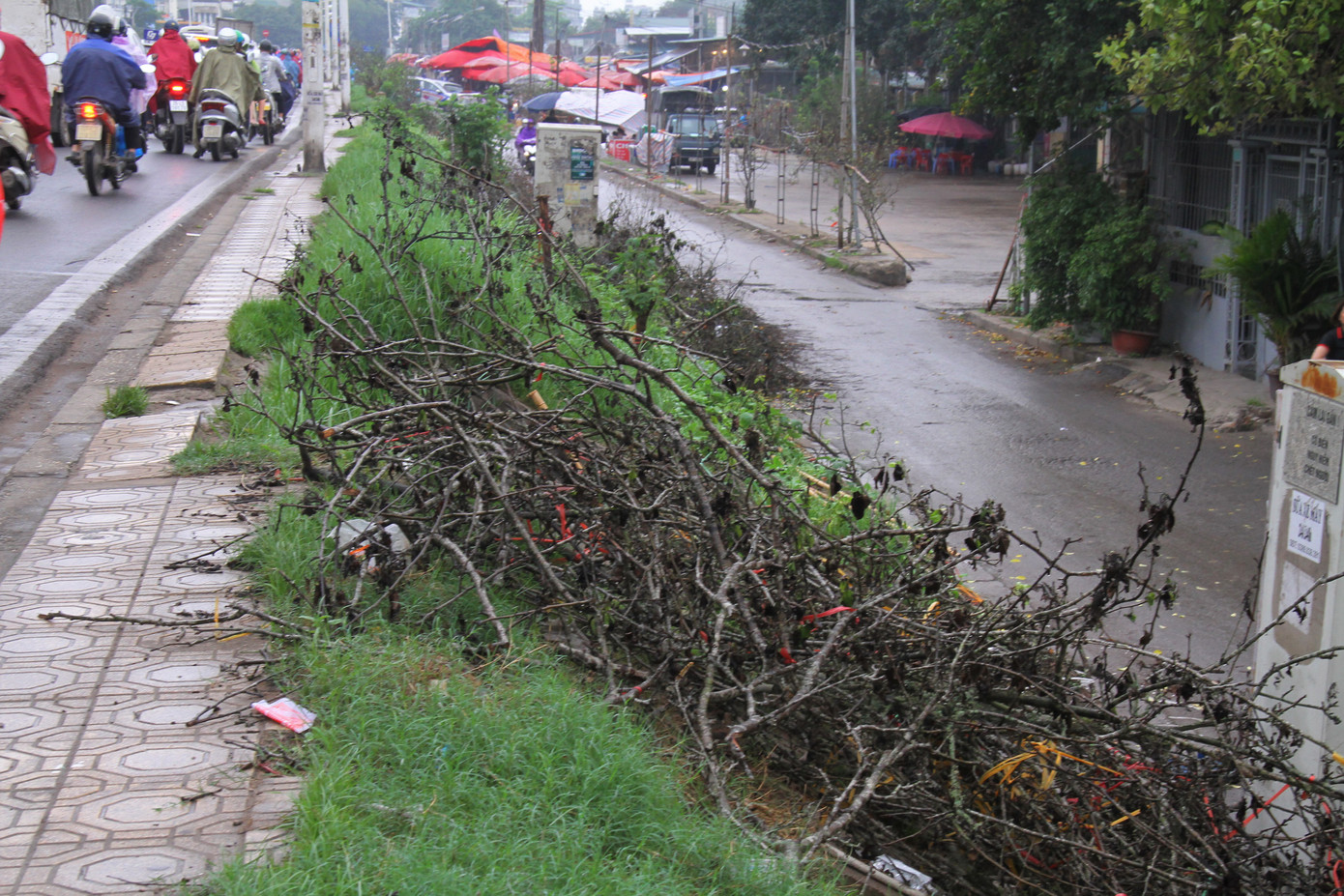 Rác sinh hoạt, các chai nhựa trước đó được dùng để cắm các cành cây giờ nằm lăn lóc giữa đường, lẫn lộn trong đống cây khô.