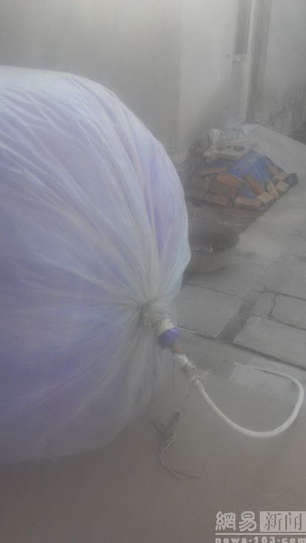 Bức ảnh này được chụp hôm Chủ nhật (6/12) tại thành phố Đông Dinh (tỉnh Sơn Đông, Trung Quốc). Trong ảnh, một bà nội trợ thản nhiên cưỡi xe đạp điện và kéo theo phía sau một chiếc túi nilon căng phồng, dài 6m đựng đầy khí gas.