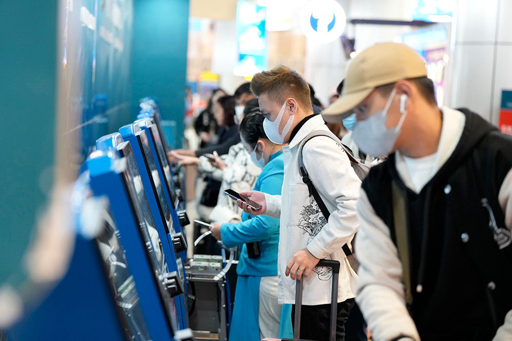 | Nhiều khách không có hành lý ký gửi chọn làm thủ tục check-in trực tuyến trước, hoặc tại các máy làm thủ tục tự động thay vì xếp hàng chờ làm thủ tục tại các quầy có nhân viên. |