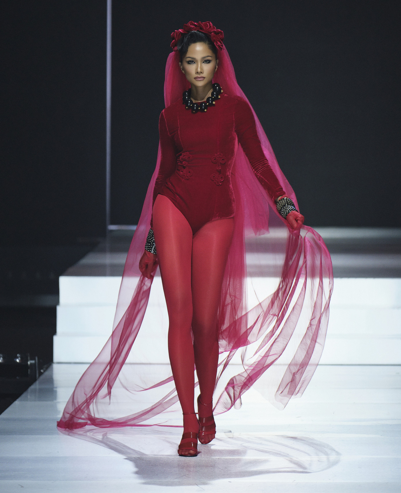 Trong đêm bế mạc tuần lễ thời trang, H’Hen Niê chọn cách trình diễn vừa phải cho BST Khải hoàn của NTK Hà Linh Thư. Với bộ trang phục điểm nhấn là khăn voan dài nhẹ nhàng, tạo cảm giác bay bổng, điểm xuyết những đoá hồng đỏ rực, H’Hen Niê thể hiện sự nữ tính trong từng bước đi, khéo khoe vóc dáng lý tưởng từ kết quả tập luyện chăm chỉ của mình.