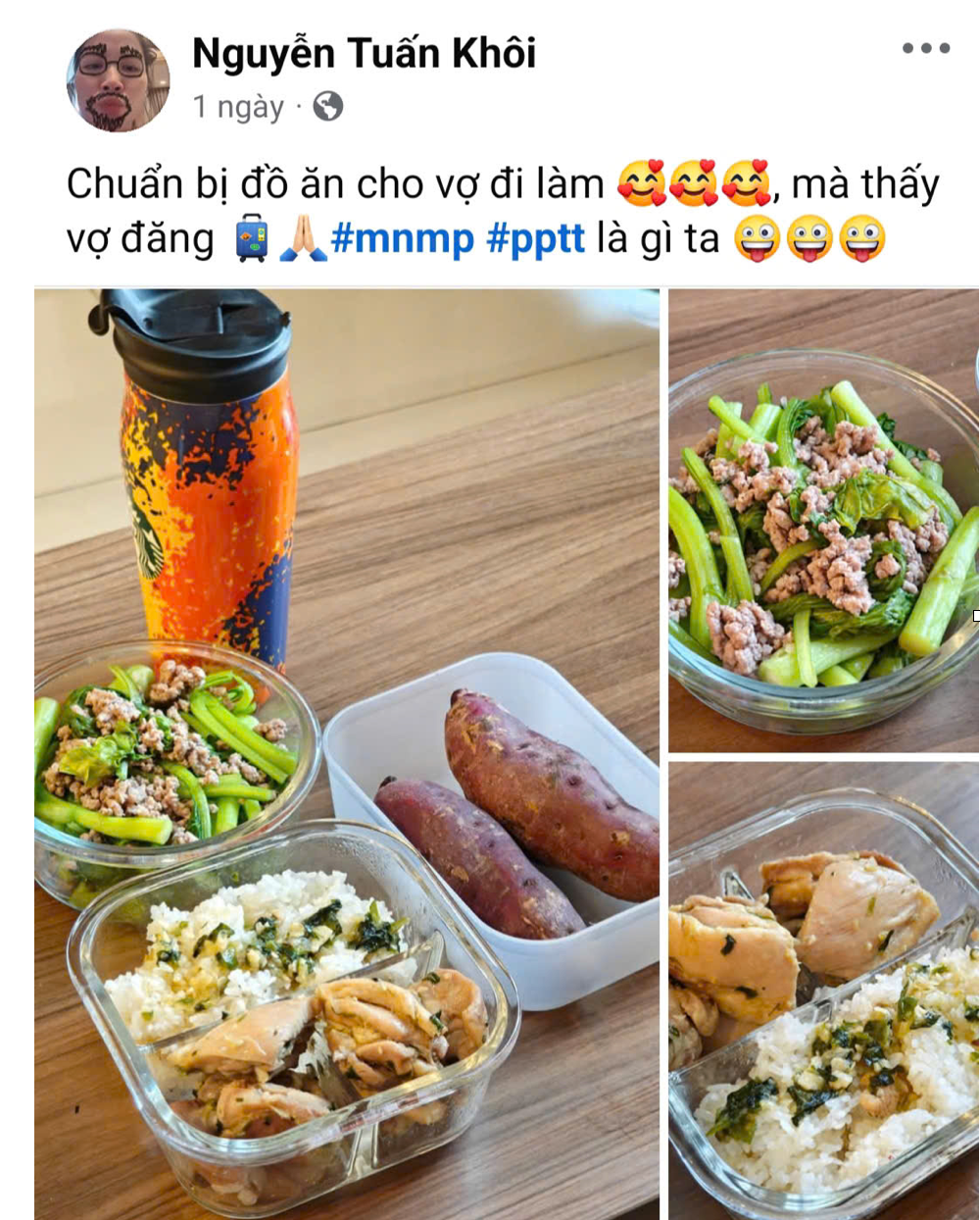 “Chuẩn bị đồ ăn cho vợ đi làm, mà thấy vợ đăng #mnmp và #pptt là gì nhỉ”.