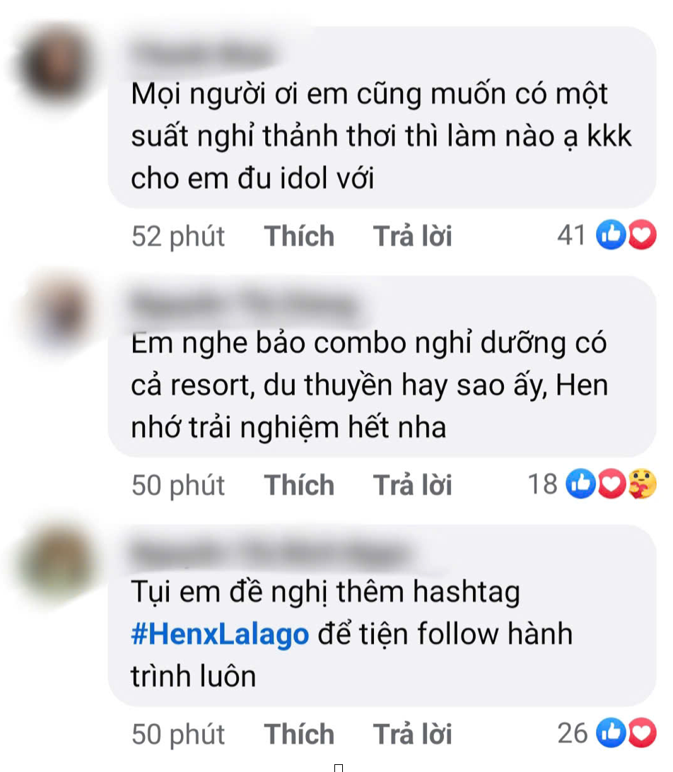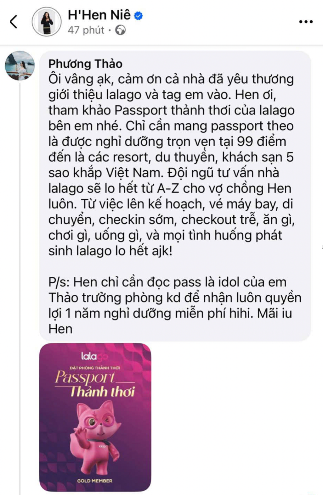 “Ôi vâng ạ, cảm ơn cả nhà đã yêu thương giới thiệu lalago và tag em vào. Hen ơi, tham khảo Passport thảnh thơi của lalago bên em nhé. Chỉ cần mang passport theo là được nghỉ dưỡng trọn vẹn tại 99 điểm đến là các resort, du thuyền, khách sạn 5 sao khắp Việt Nam. Đội ngũ tư vấn nhà lalago sẽ lo hết từ A-Z cho vợ chồng Hen luôn. Từ việc lên kế hoạch, vé máy bay, di chuyển, checkin sớm, checkout trễ, ăn gì, chơi gì, uống gì, và mọi tình huống phát sinh lalago lo hết ạ!