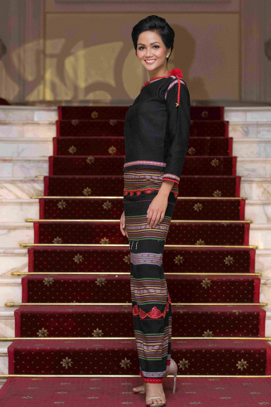 Hoa hậu kết hợp pha trộn váy thổ cẩm mang đặc trưng của văn hóa truyền thống dân tộc Ê đê với giày cao gót hiện đại