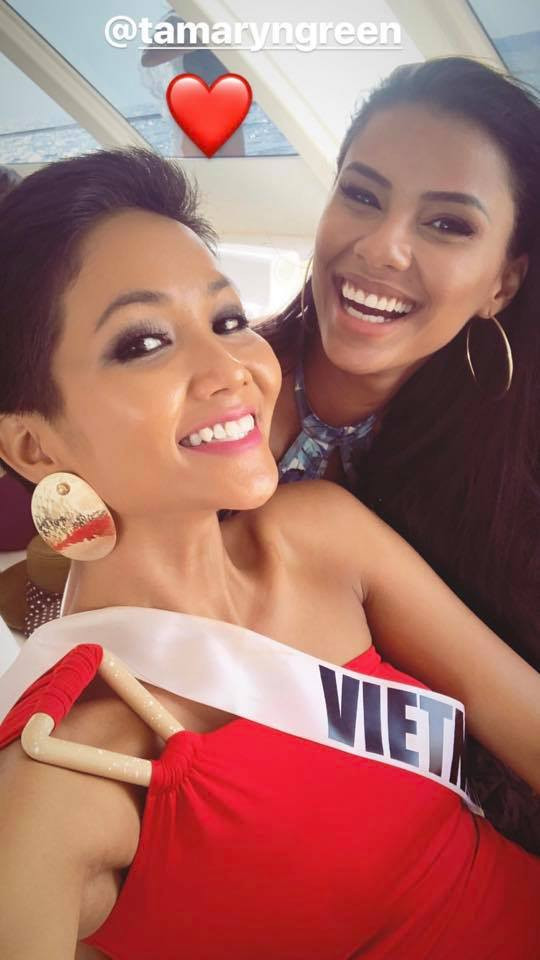 Buổi chiều, H’Hen Niê cùng các thí sinh được đi thuyền ra biển. Cô gây ấn tượng khi mang dép tổ ong, cùng hoa hậu Korea - bạn cùng phòng.