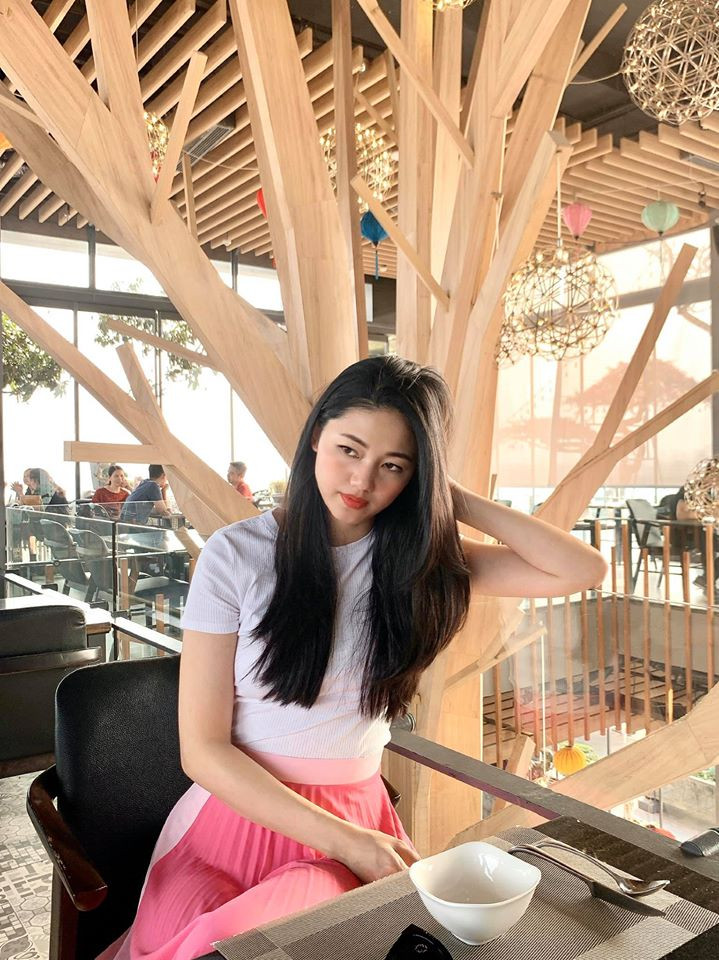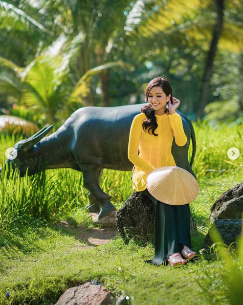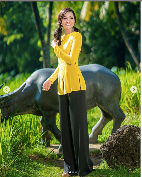 Người đẹp giản dị nhưng không kém phần nổi bật với áo bà ba màu vàng rực rỡ, cột tóc đuôi ngựa dịu dàng.